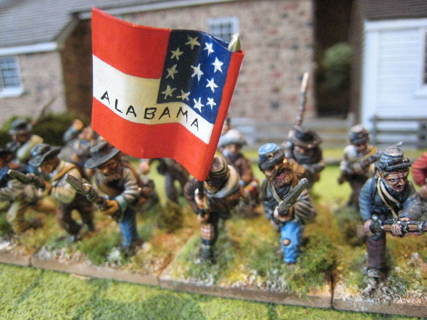 This unit contains many of the very first Dixon ACW figures I painted back in 1998, so the painting's a bit rough and ready.  I don't think I did much in the way of proper research into  uniforms, and so probably just used a variety of blues, browns and greys.  I'm sure ACW aficionados will be able to spot all kinds of errors.  I can't now recall why I chose an Alabama regiment - I expect it was because in those days I had grand designs about wargaming Gettysburg and so wanted to start out with the brigade that charged up Little Round Top.  I painted the two flags myself.  I did think about replacing them with more accurate GMB flags (the flags themselves are not permanently glued to the staffs), but I realised that I'm quite attached to these early efforts and so decided to keep them.  In the "Guns of Gettysburg" scenario book for Jackson's Valley Campaign, the 15th appear in 3 scenarios: Freeman's Ford (12 figures), First Winchester (20) and Cross Keys (24).